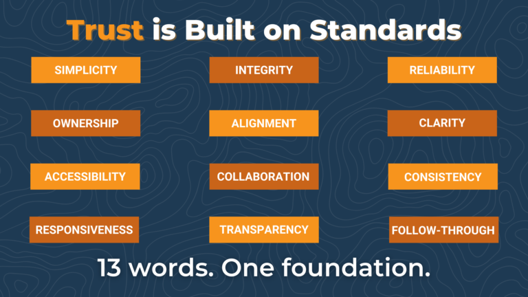 Transparency. Follow-through. Accessibility. Clarity. Consistency. Responsiveness. Integrity. Reliability. Ownership. Alignment. Collaboration. Simplicity.
